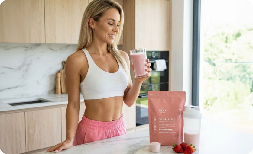 Białko Slim Whey Protein + Glucomannan (smak truskawkowy) to pyszne białko długo sycące - idealne dla osób na redukcji masy ciała, które chcą schudnąć lecz nie chcą być głodne. Innowacyjne połączenie koncentratu białka serwatkowego z naturalnym glukomannanem, który w ramach diety niskokalorycznej pomaga w utracie wagi. Idealnie jako szybki shake rano, w ciągu dnia lub po treningu.